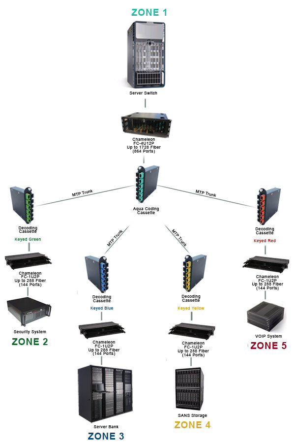 Chameleon is a patent-pending fiber optic solution designed to meet the increasing demand for high-density space-saving applications. The 4U chassis can fit 12 144-fiber MTP brand cassettes for a total of 1728 fibers. The Chameleon also has Category 5E, Media Converter, and Ethernet switch cassettes available along with standard adapter panels. |
